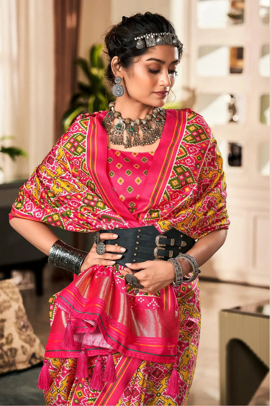 Pink Handloom Silk Saree with Patola Print & Tassel Pallu