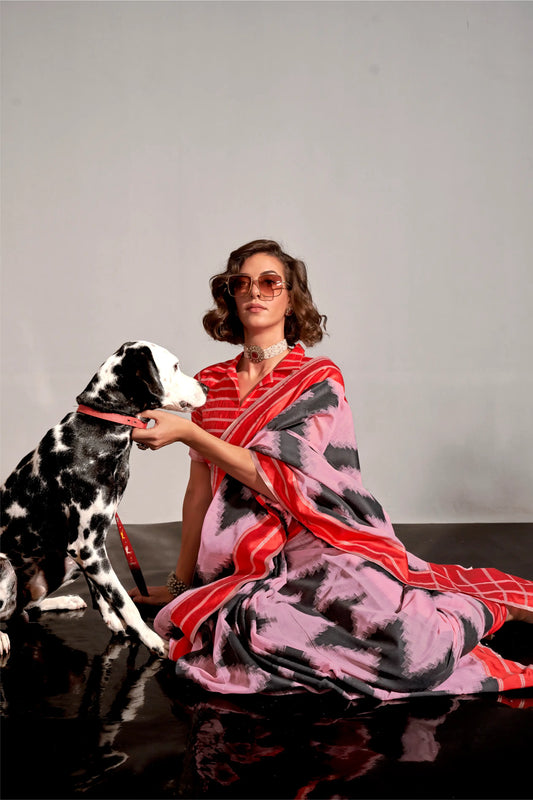 Pink Silk Saree With Contrast Ikkat Design Pallu