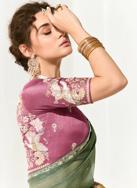 Sage Green Organza Saree Blouse With Heavy Embroidery work