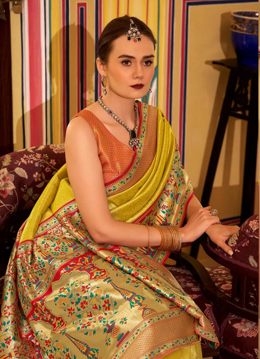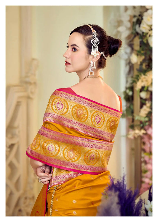 Yellow Pure Soft Banarasi Silk Saree with Zari Weaving & Contrast Border