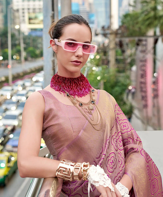 Onion Handloom Kanchivaram Silk Saree with Zari Weaving
