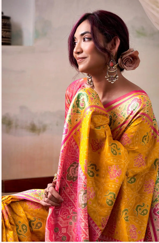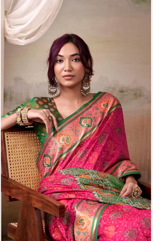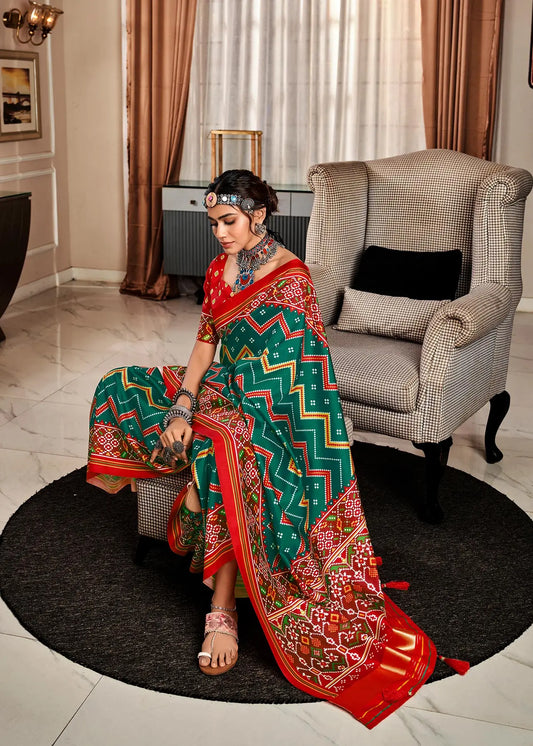 Dark Green Handloom Silk Saree with Patola Print & Tassel Pallu
