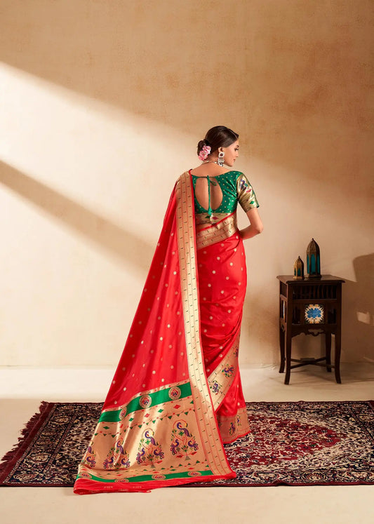Red Paithani Silk Saree with Zari Weaving & Rich Pallu