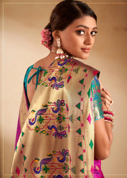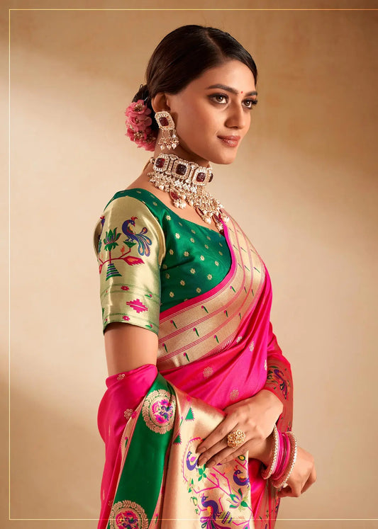 Rani Pink Paithani Silk Saree with Zari Weaving & Rich Pallu