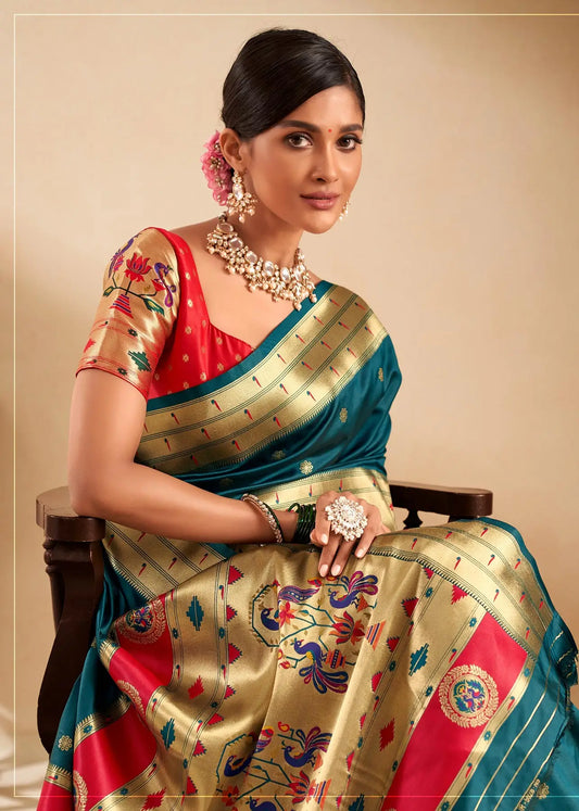 Teal Blue Paithani Silk Saree with Zari Border & Rich Pallu