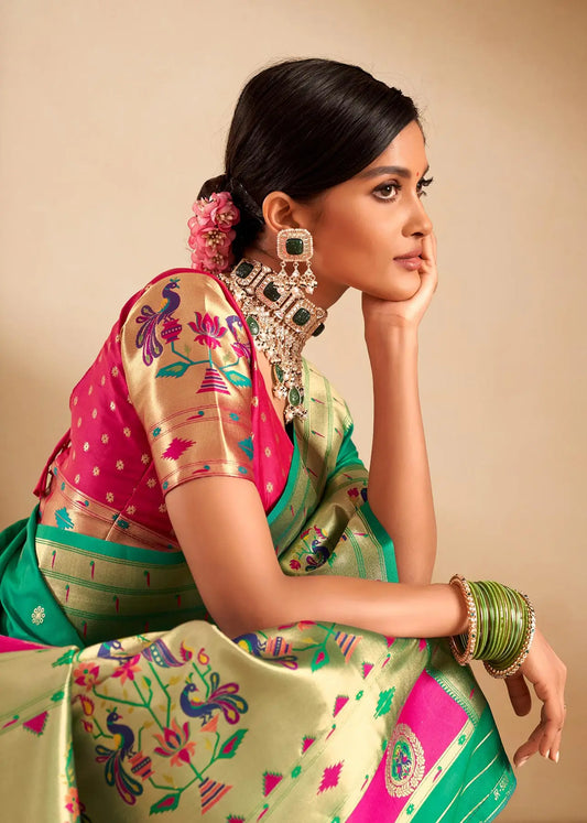 Green Paithani Silk Saree with Zari Weaving & Rich Pallu