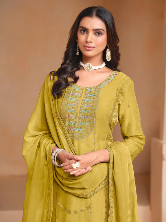 Olive Green Gold Crush Salwar Suit With Sequins & Thread Embroidery Work