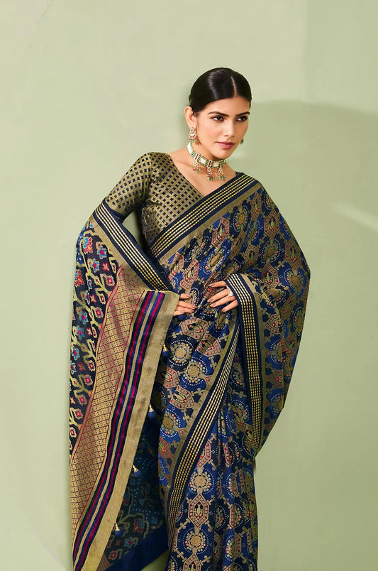 Dark Blue Pure Banarasi Silk Saree with Zari Weaving & Contrast Border