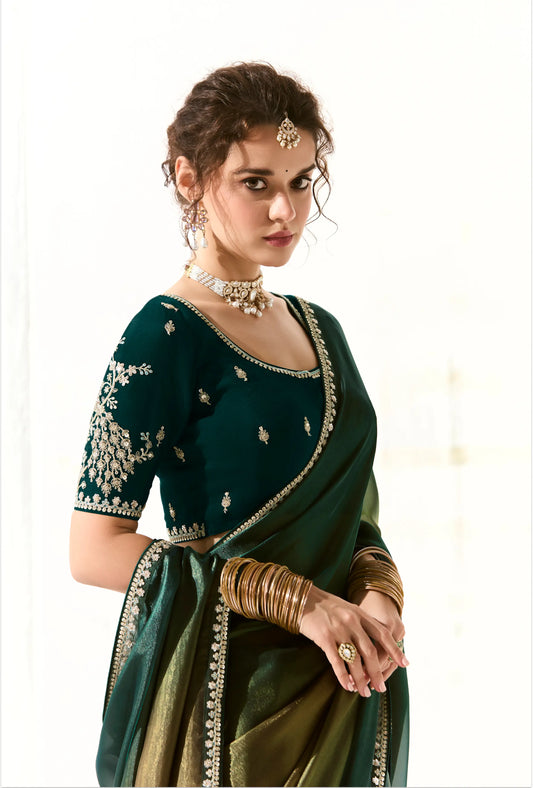 Green Shaded Organza Saree Blouse With Heavy Embroidery work