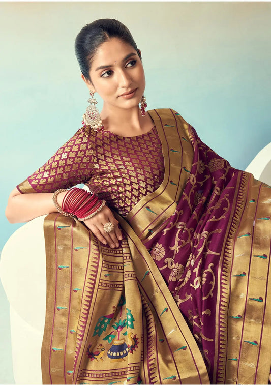 Purple Satin Brasso Handwoven Silk With Flower Weaving Saree