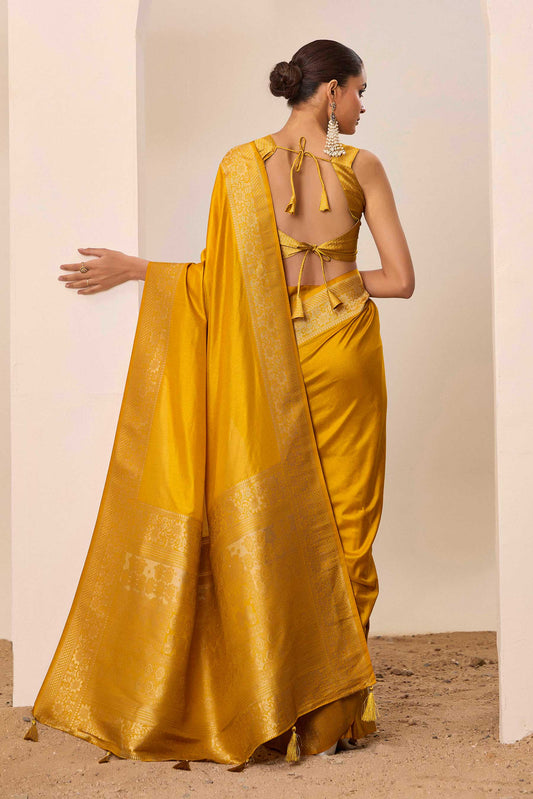 Yellow Pure Banarasi Silk Saree with Zari Weaving & Contrast Border