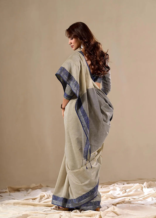 White Linen Silk Saree with Zari Border