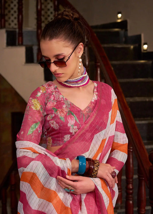 Peach Brown Digital Floral Print With Mirror Cut Work Saree