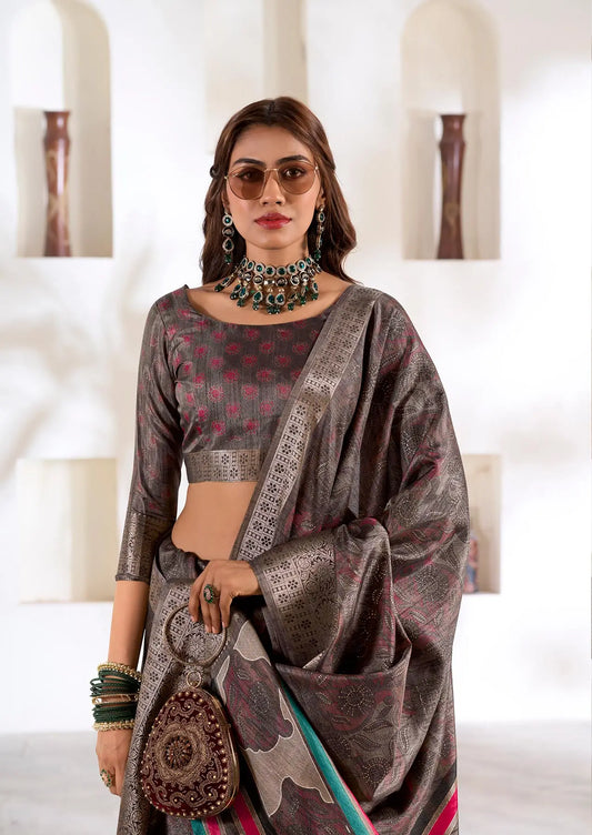 Dark Grey Dola Silk Printed Saree with Fancy Zari Border