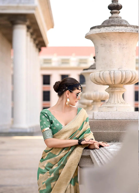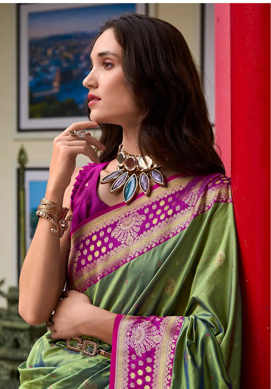 Green Silk Saree with Banarasi Zari Weaving & Contrast Border