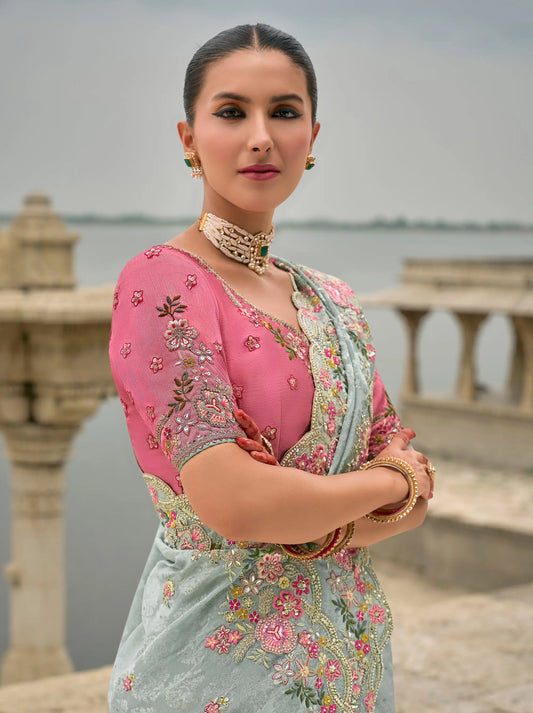 Sky Blue Viscose Jacquard Saree With Embroidery Pearls Khatli Zari Weaving Work