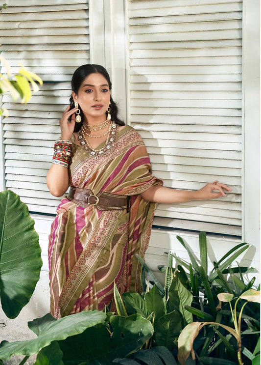 Olive Green With Multi Color Digital Print Ready To Wear One Minute Saree