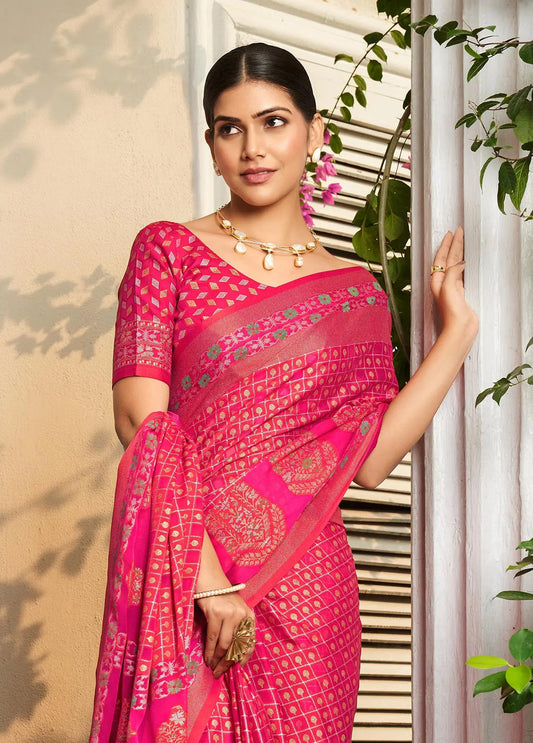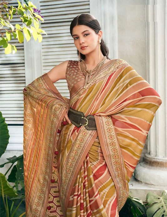 Peach Silk Printed Saree with Fancy Zari Border