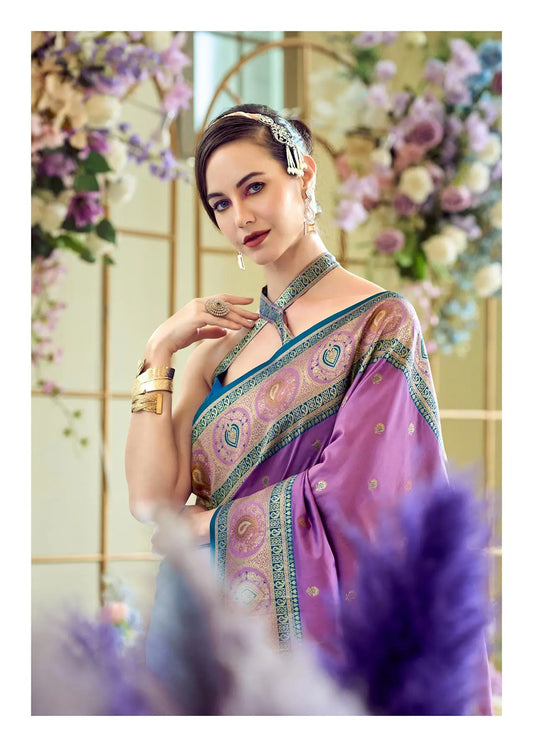 Dusty Purple Pure Soft Banarasi Silk Saree with Zari Weaving & Contrast Border