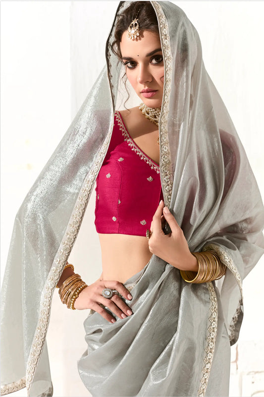 Silver Grey Organza Saree Blouse With Heavy Embroidery work