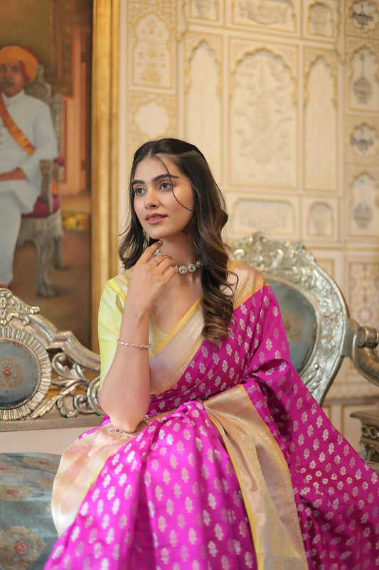 Green Silk Saree with Banarasi Zari Weaving & Contrast Border