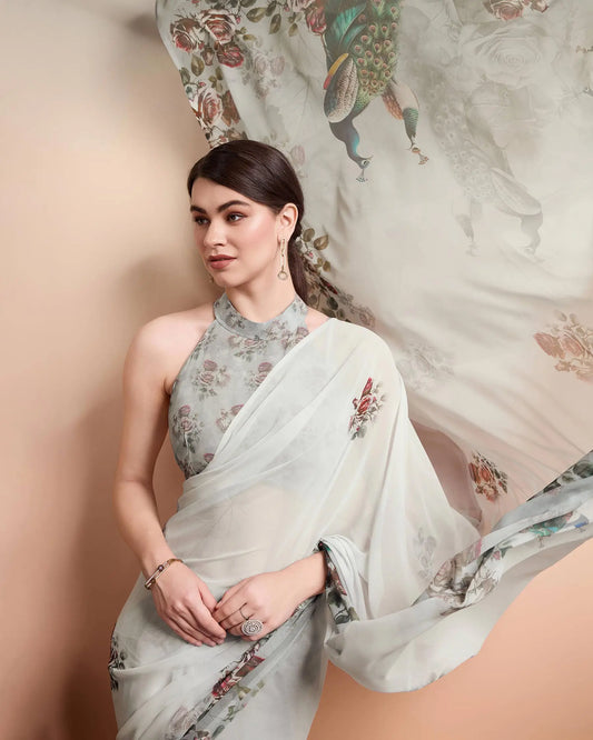 Cloudy Blue Digital Floral Print With Mirror Cut Work Saree
