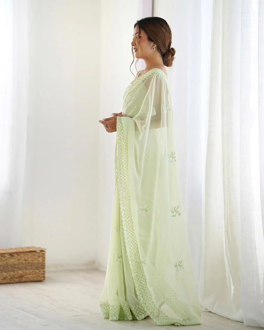 Pista Green Party Wear Saree With Sequence & Thread Embroidery Work