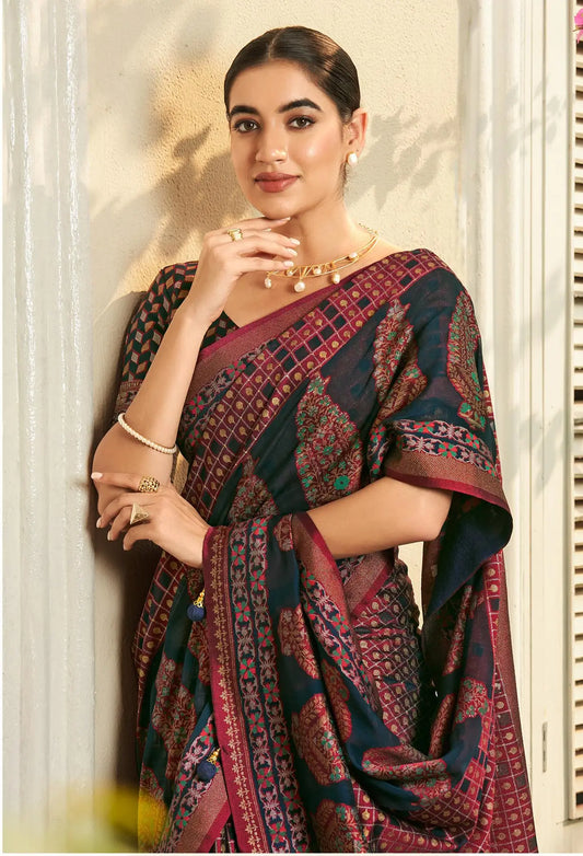 Navy Blue Weightless Marbal Saree With Pearl Lace Border & Floral Print