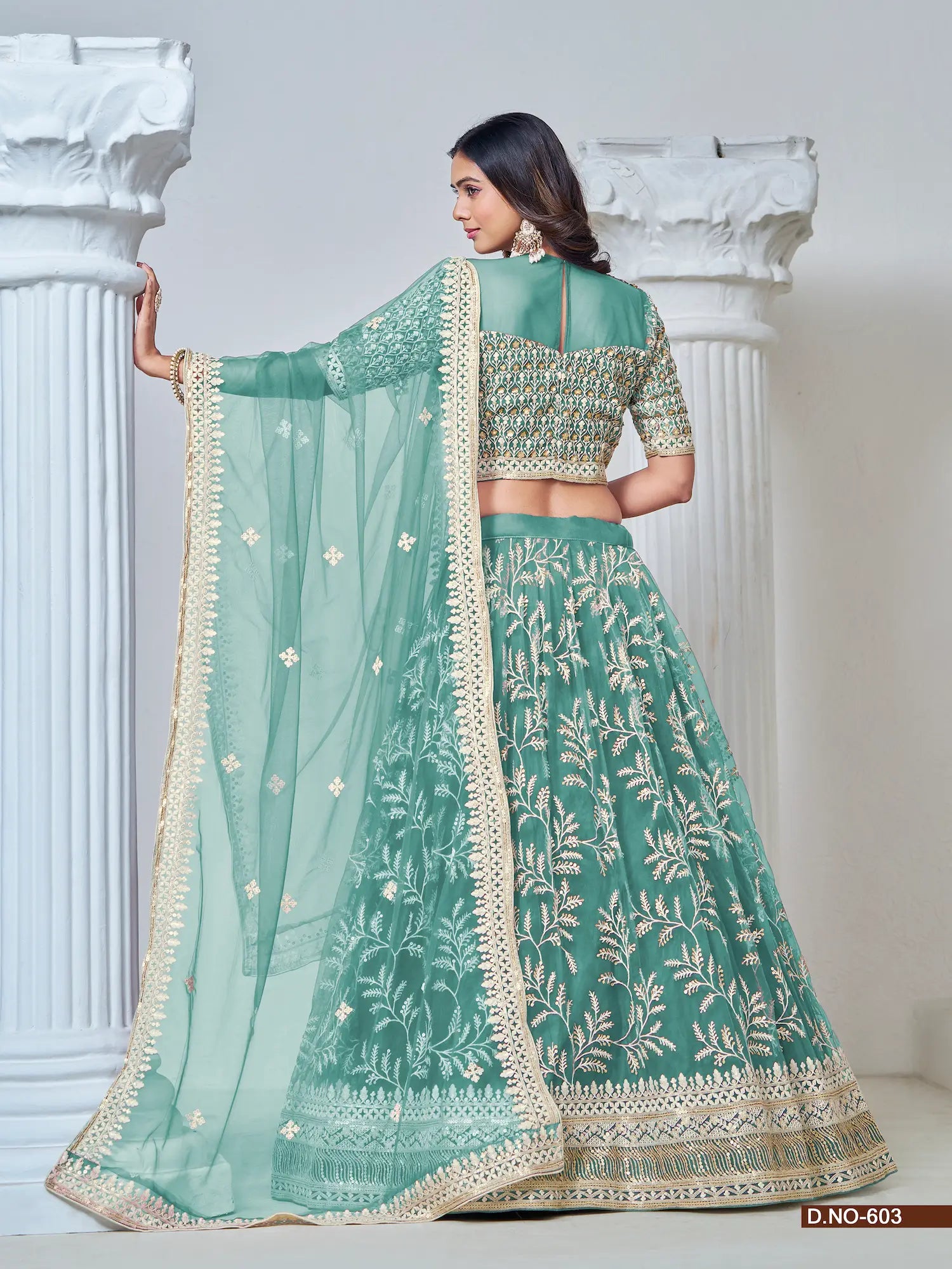 Aqua Blue Net Lehenga Choli With Thread & Sequence Embroidery Work