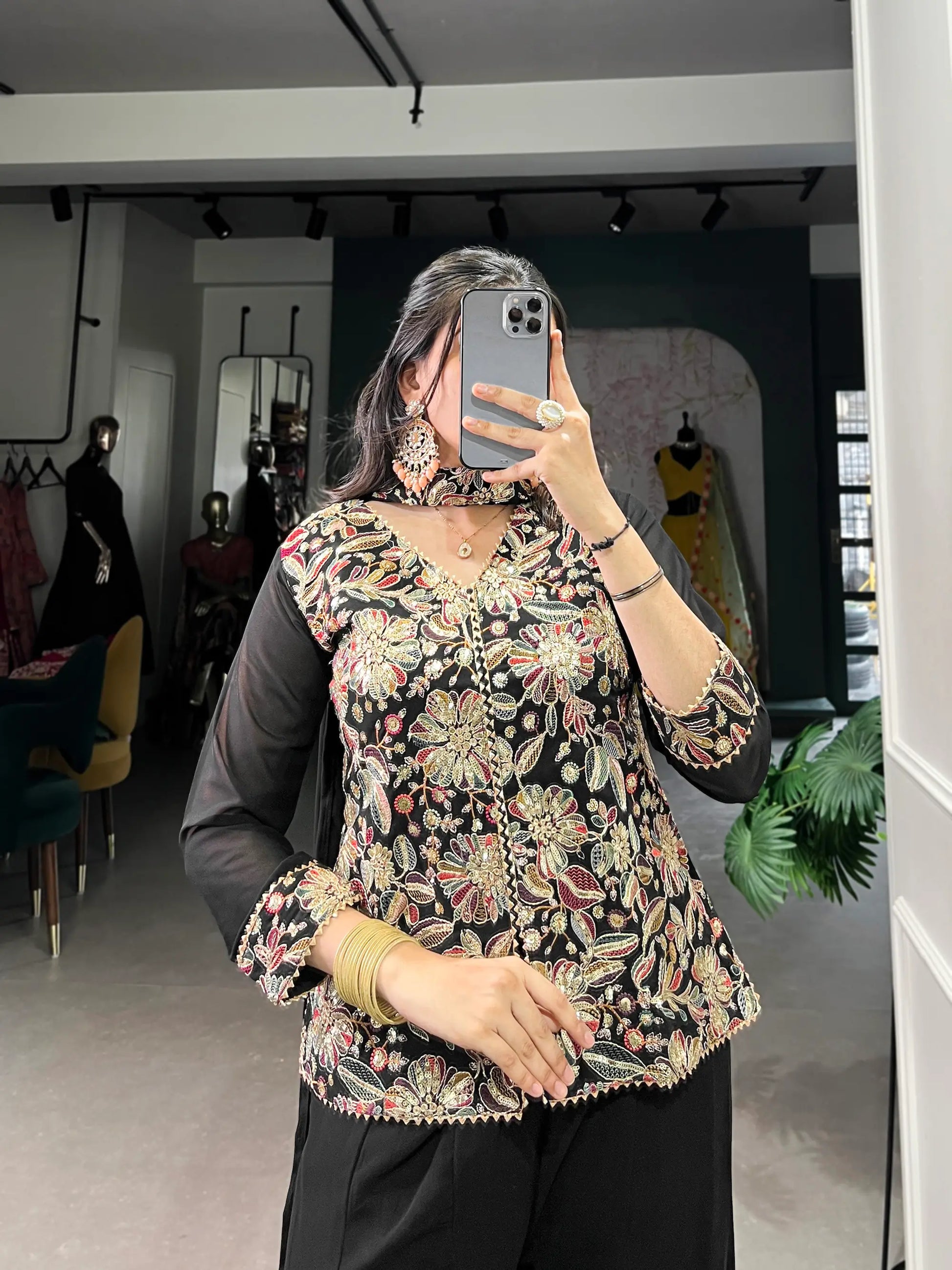 Black Georgette Thread & Sequins Embroidery Work Indo Western Set