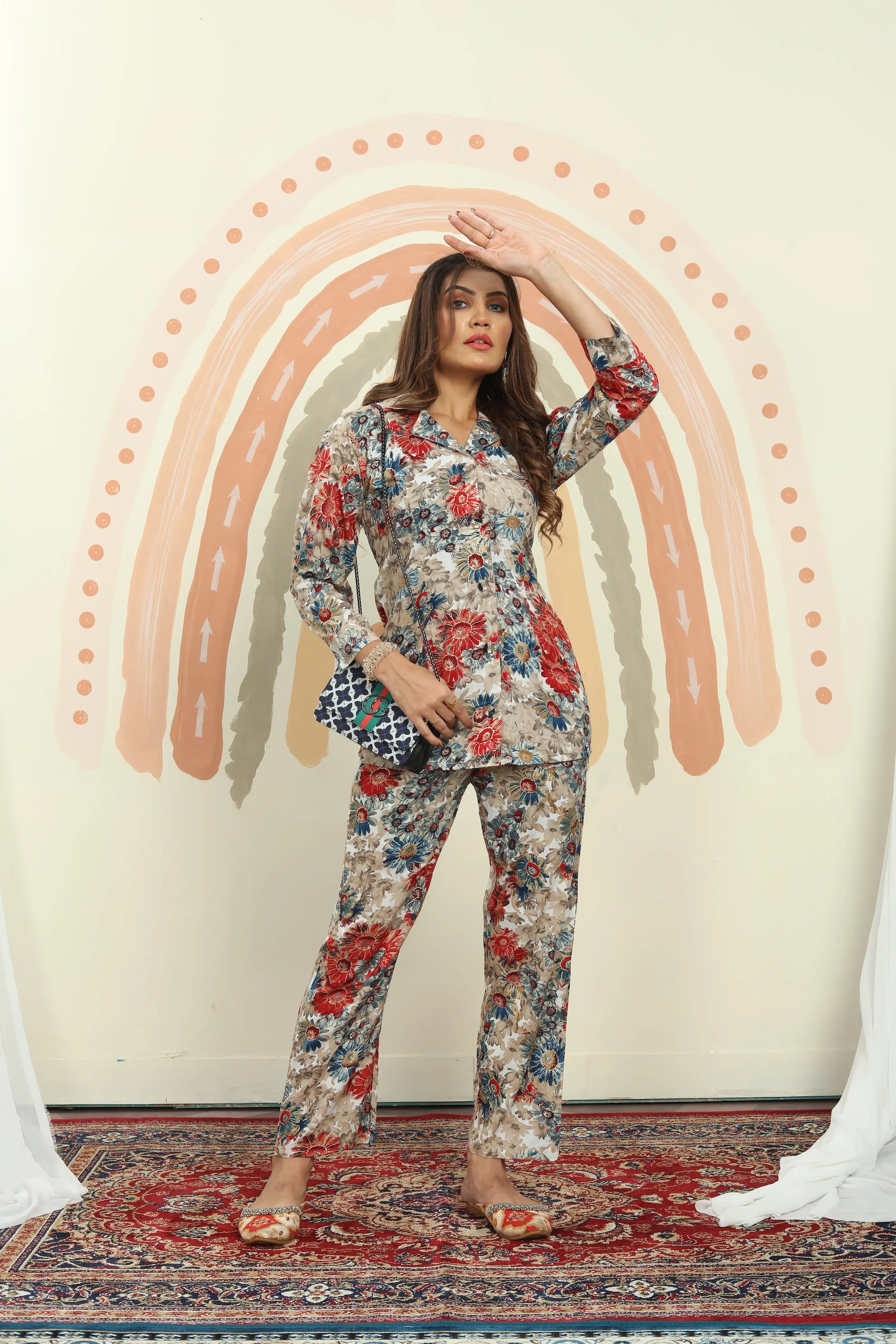 Our Blue And Beige Floral Print co-ord set crafted from lightweight rayon offers a perfect blend of comfort and style. Whether you're headed to the office or out for daily errands, it offers a sophisticated, versatile outfit.
