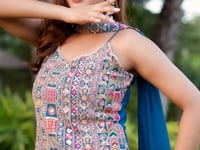 Gracefully crafted in luxurious Chinon fabric, this salwar suit features a beautifully embroidered top with delicate sequence work. The plain Chinon bottoms offer a sleek contrast, while the matching dupatta with embroidered border elevates the entire look with subtle charm.