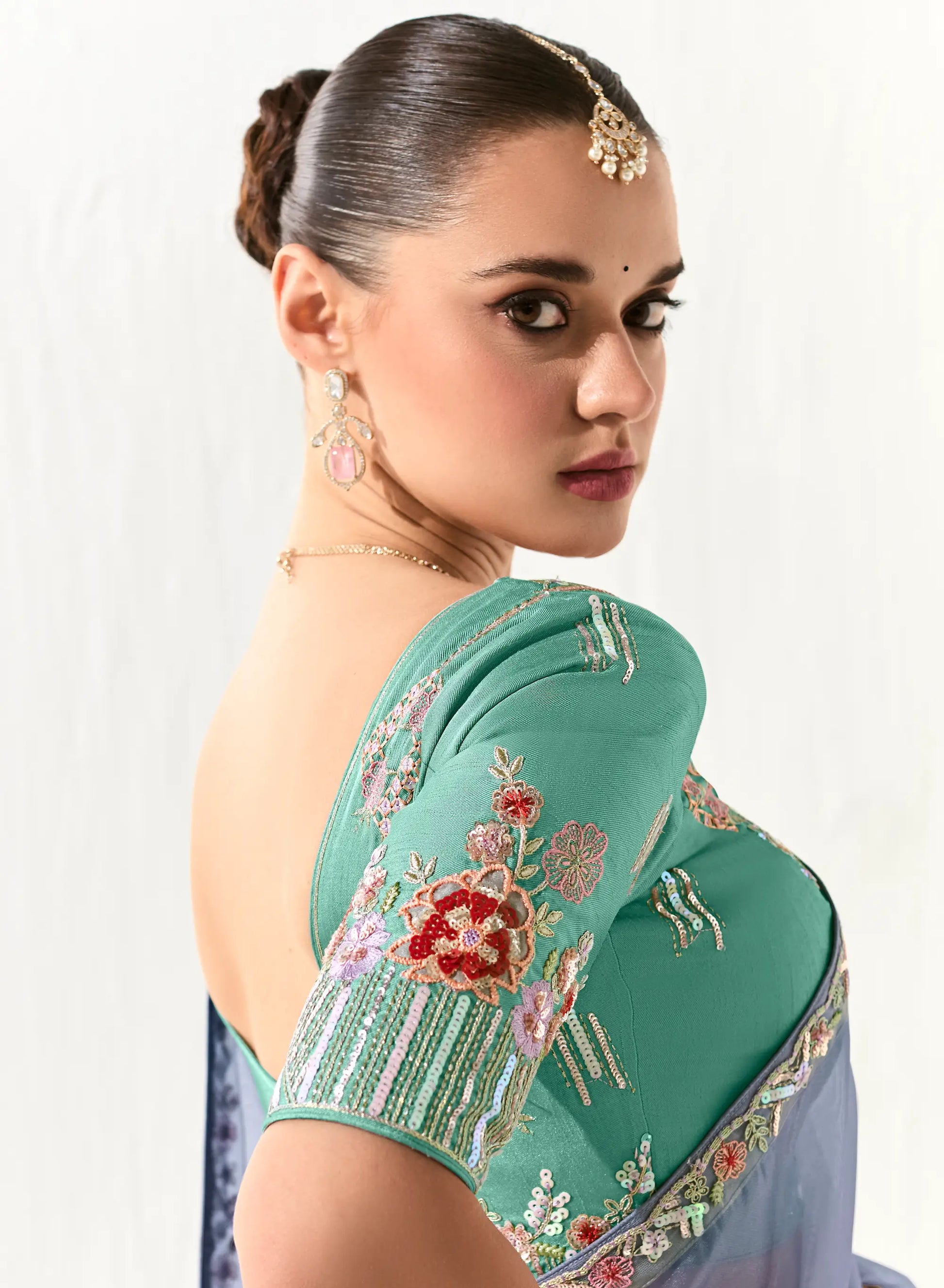 Blue Grey Organza Saree Blouse With Heavy Embroidery work