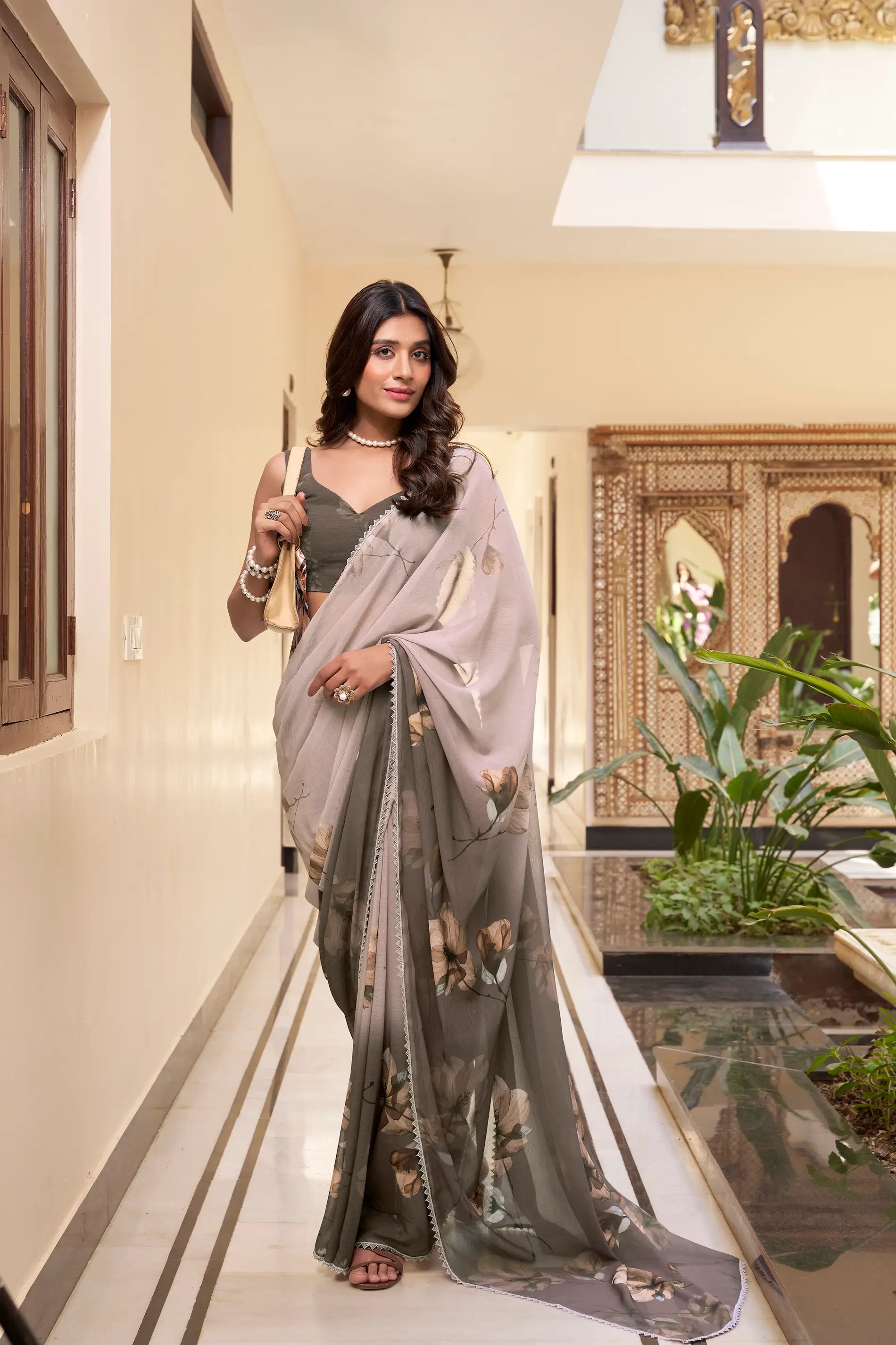 Brown Weightless Marbal Saree With Floral Print & Lace Border