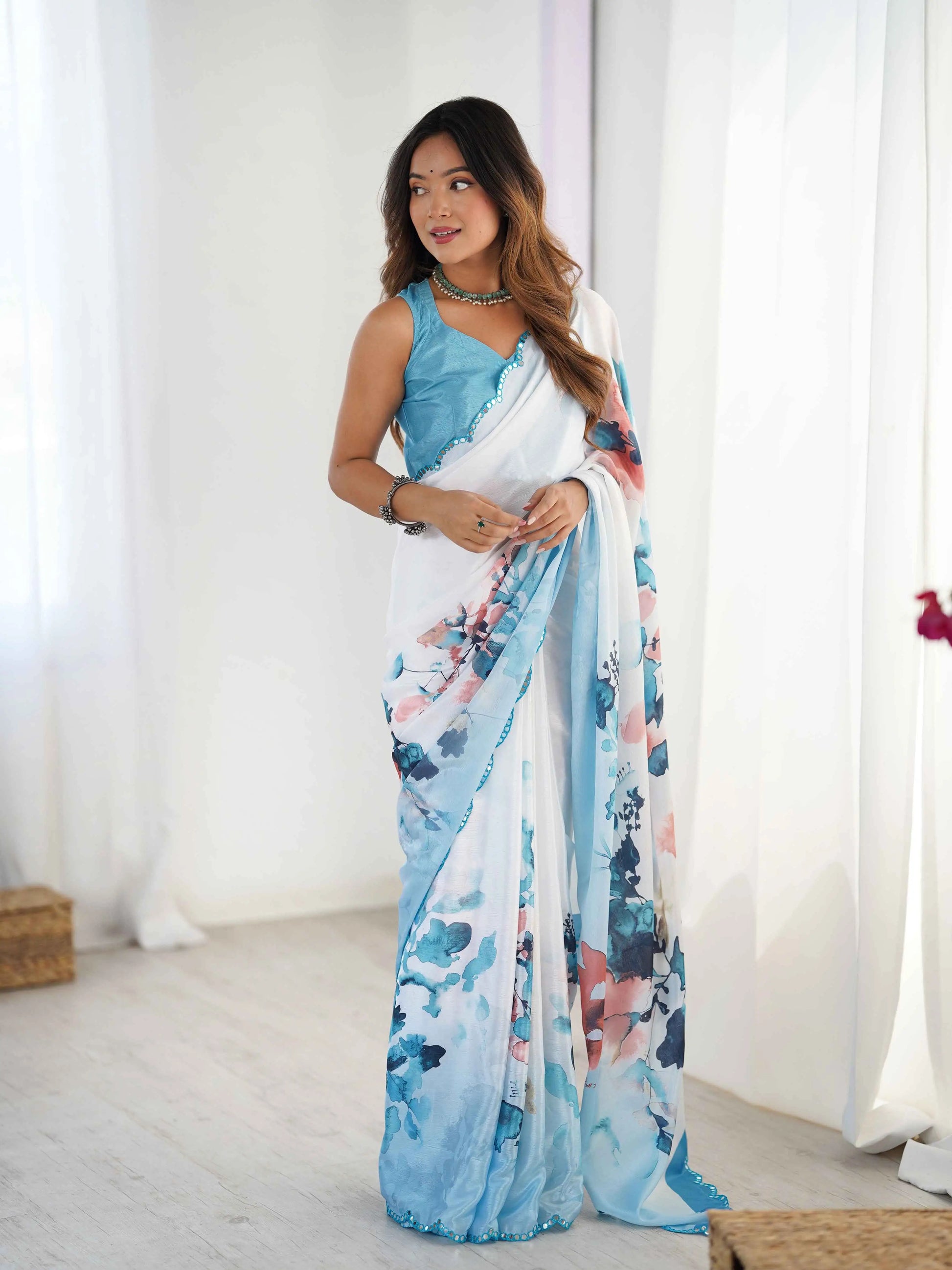 Cloudy Blue Digital Floral Print With Mirror Cut Work Saree