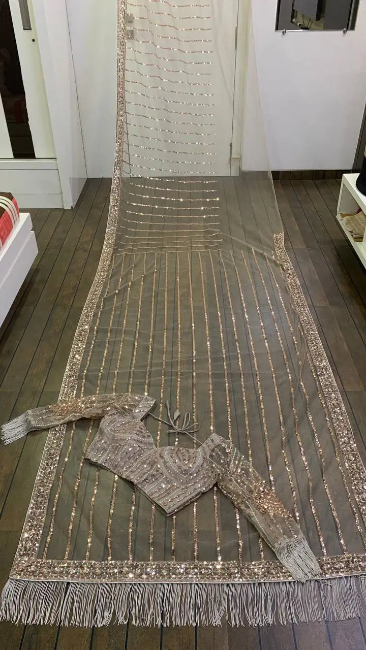 Dark Beige Net Saree With Sequins, Dori & Zari Work
