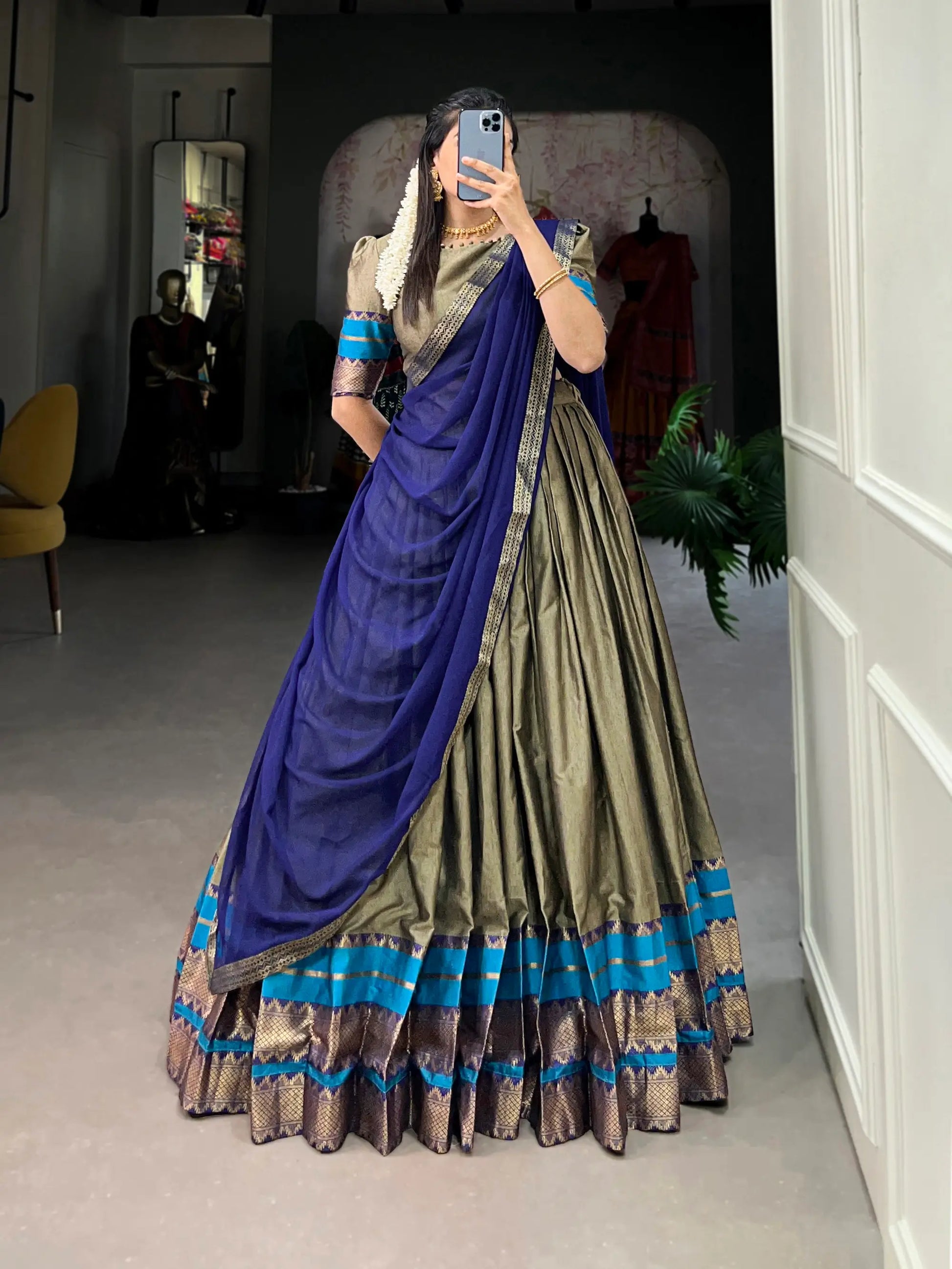 Dark Beige Poly Cotton Lehenga Choli with Zari Weaving Work