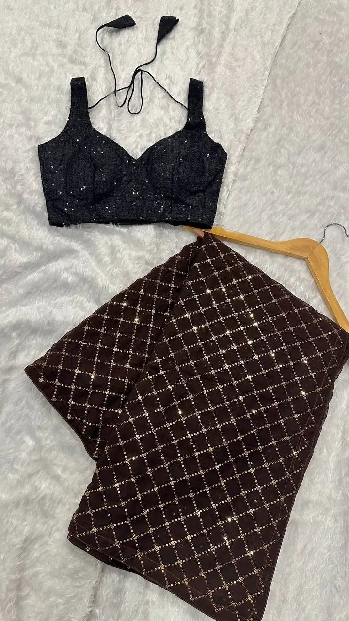 Dark Brown Georgette Saree With Sequins Embroidery Work