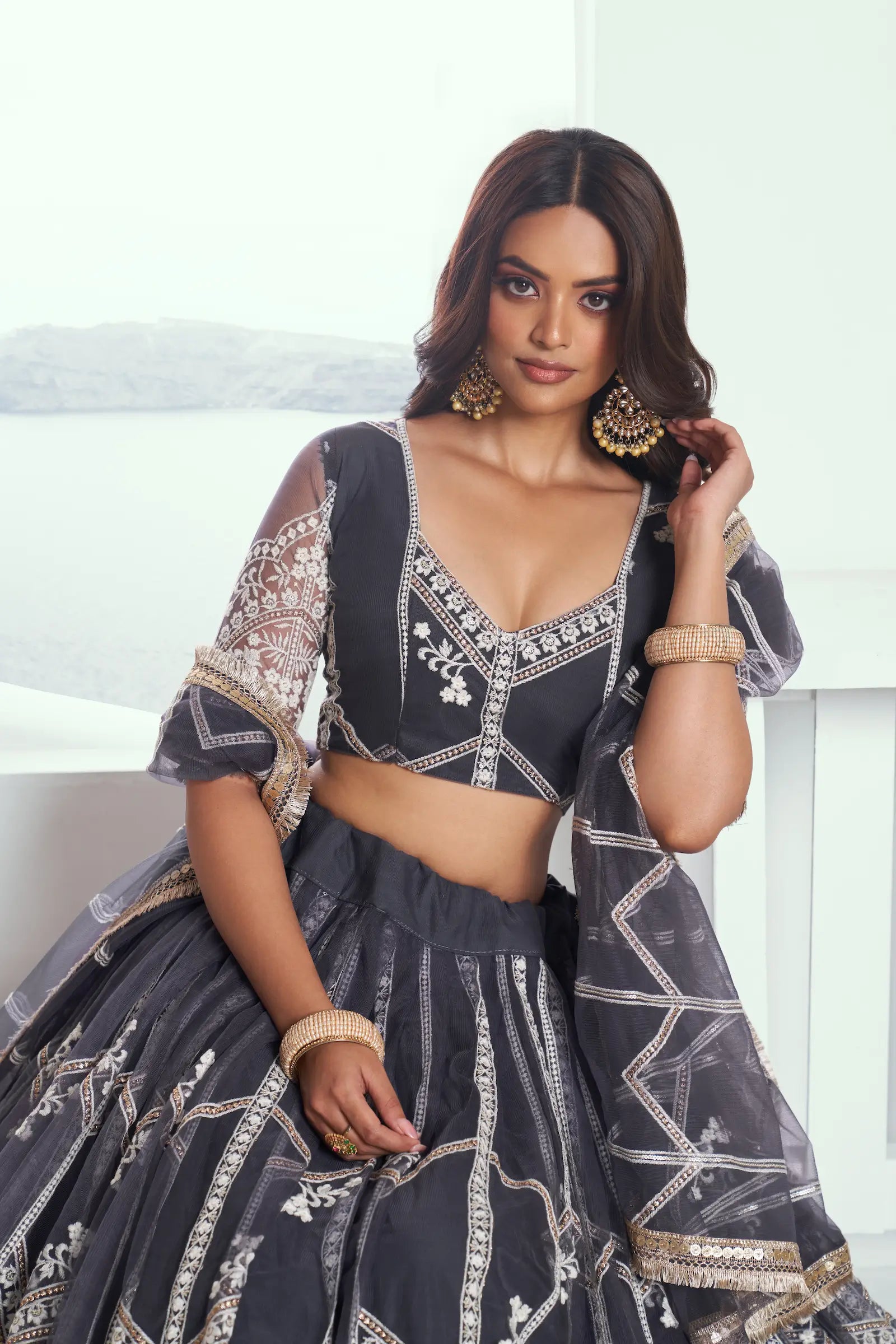 Dark Grey Net Lehenga Choli With Sequence & Cotton Thread Work Embroidery Work