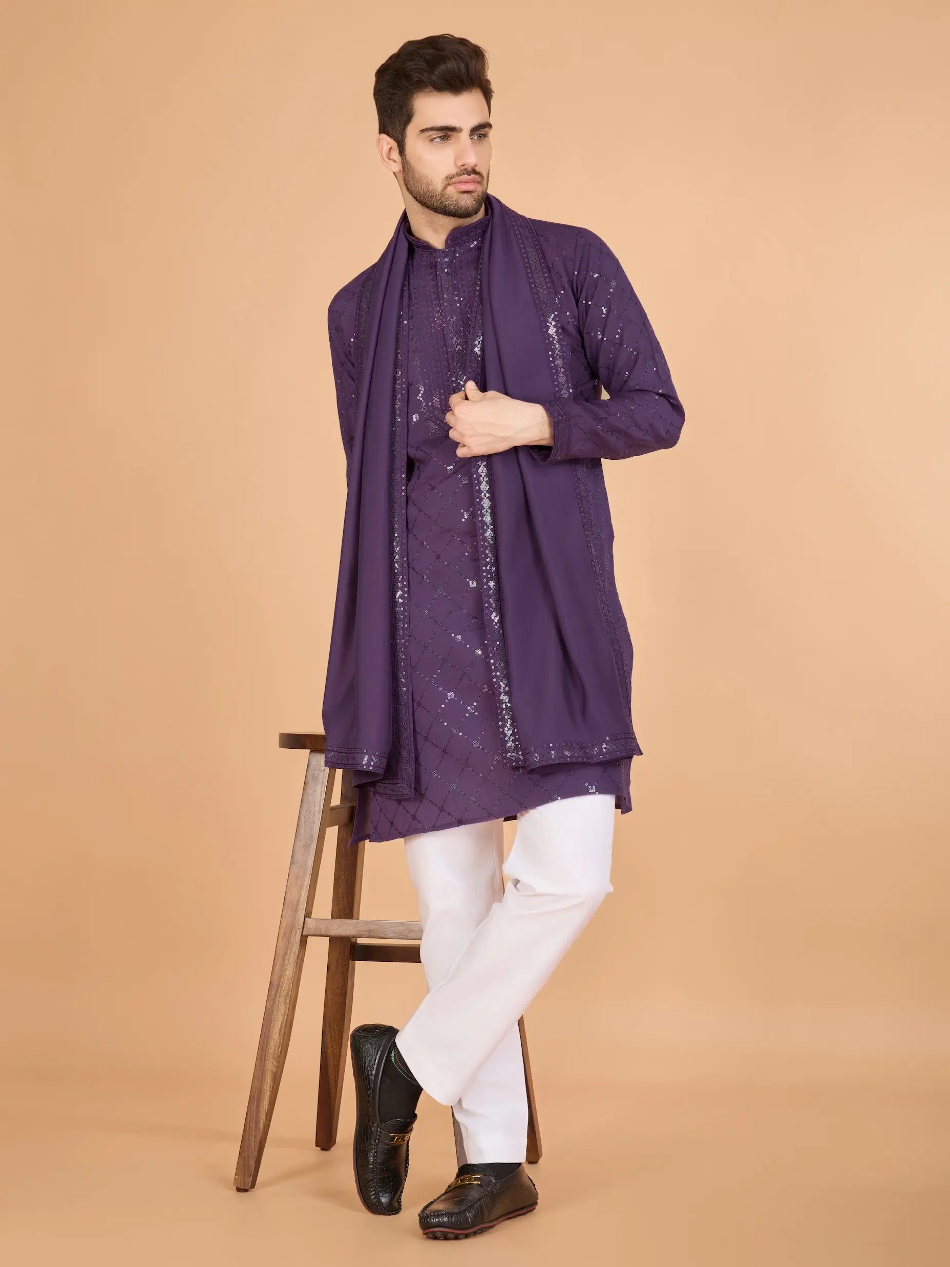 This exquisite Dusty Purple Silk fabric  Kurta With Matching Dupatta features intricate thread and sequins embroidered work, making it perfect for adding a touch of elegance to any special occasion. Ideal for weddings, religious ceremonies, and cultural events, it beautifully blends tradition with modern flair. The delicate embroidery adds a timeless charm, elevating the overall aesthetic.