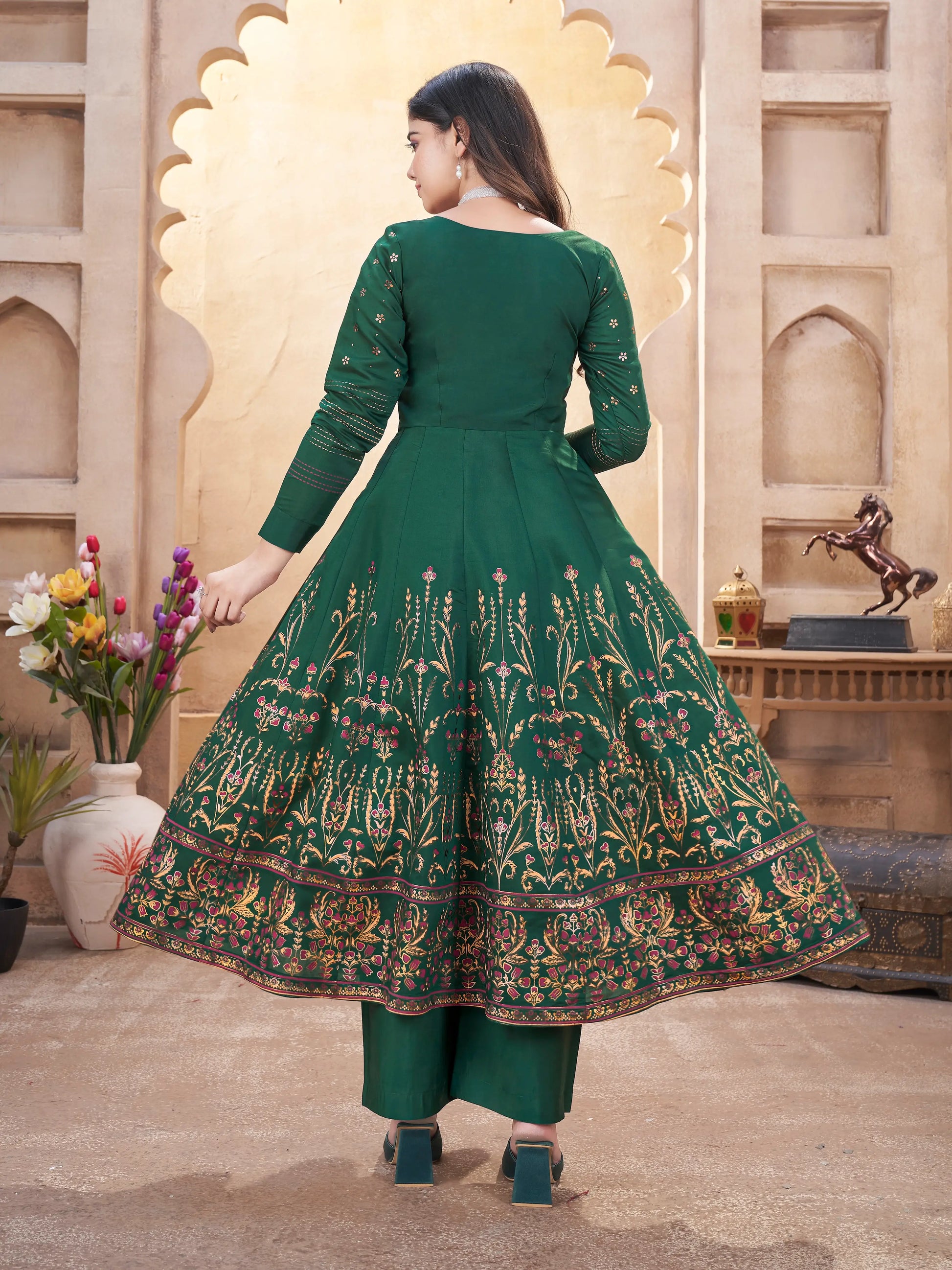 Green Mirror Work And Foil Print Silk Salwar Suit