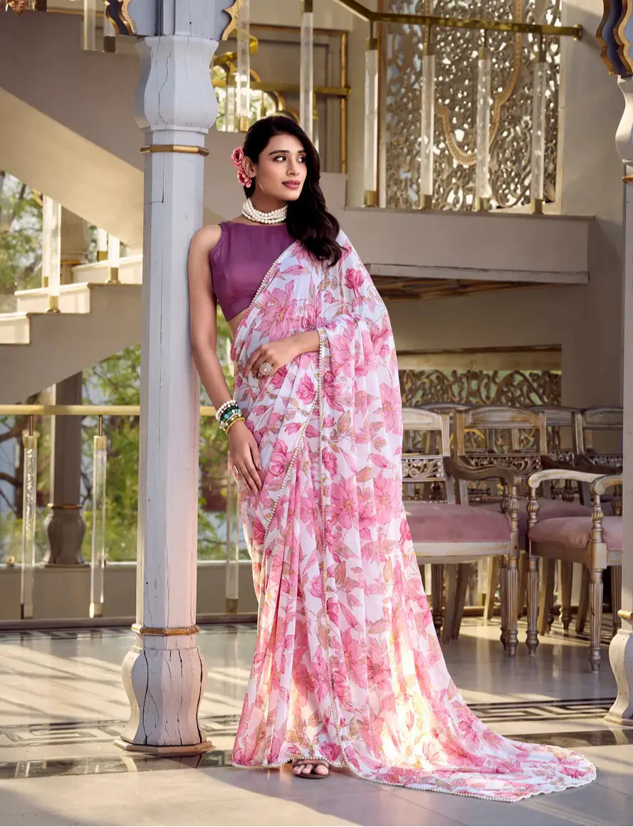 Light Pink Weightless Marbal Saree With Floral Print & Pearl Lace Border