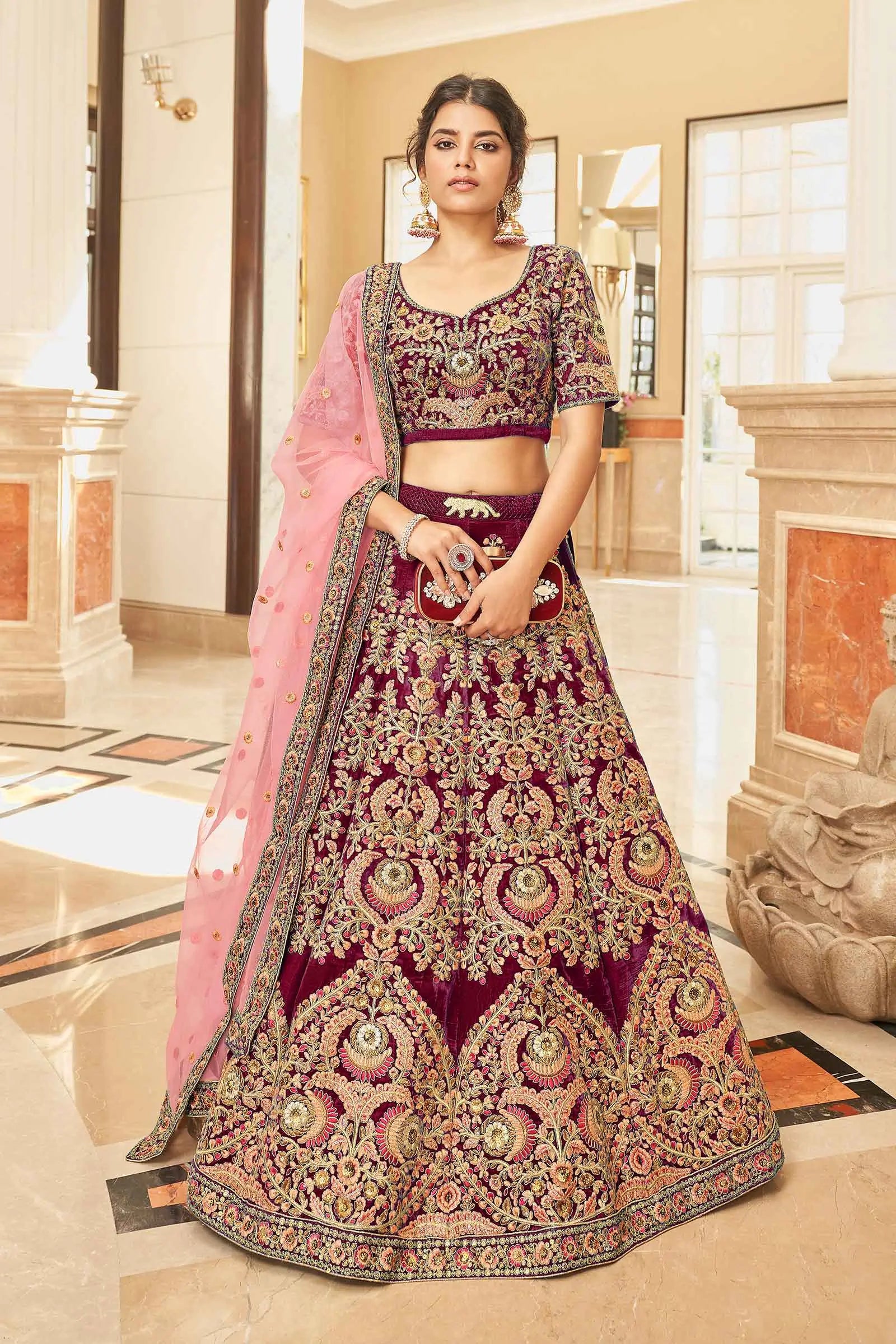 Maroon Velvet Lehenga Choli With Thread, Dori, Zari And Sequins Embroidered Work