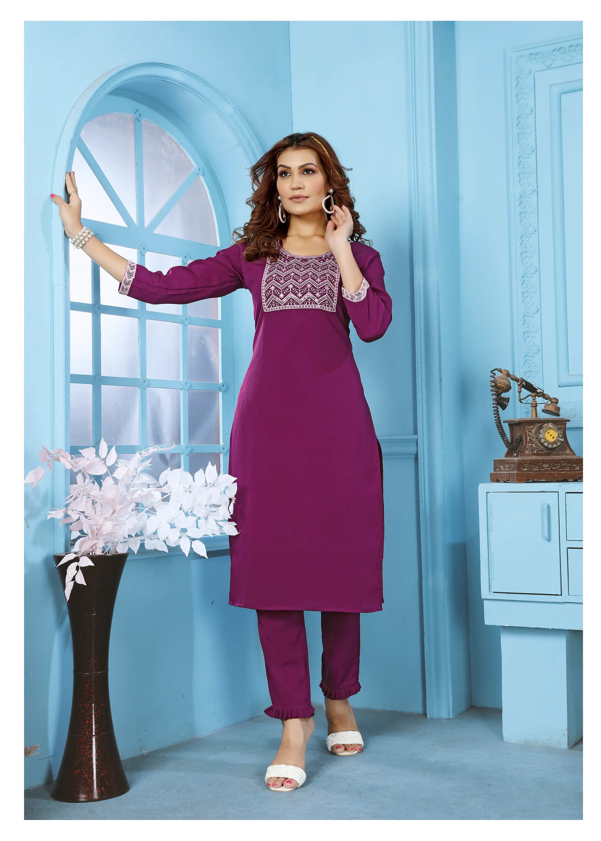 Experience our Mulberry Purple Kurta Set featuring a straight-cut kurta with embroidery work, paired with comfortable cotton pant. Perfect for daily wear, it offers both style and ease, making it an ideal choice for various occasions.
