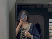 This navy blue salwar suit features a rich velvet top with sequins and thread embroidery, paired with velvet bottom & organza dupatta adorned with sequins and thread work, perfect for festive or evening wear.