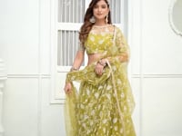 Olive Green Net Lehenga Choli With White Cotton Thread Work, Zari Work & Sequence Work