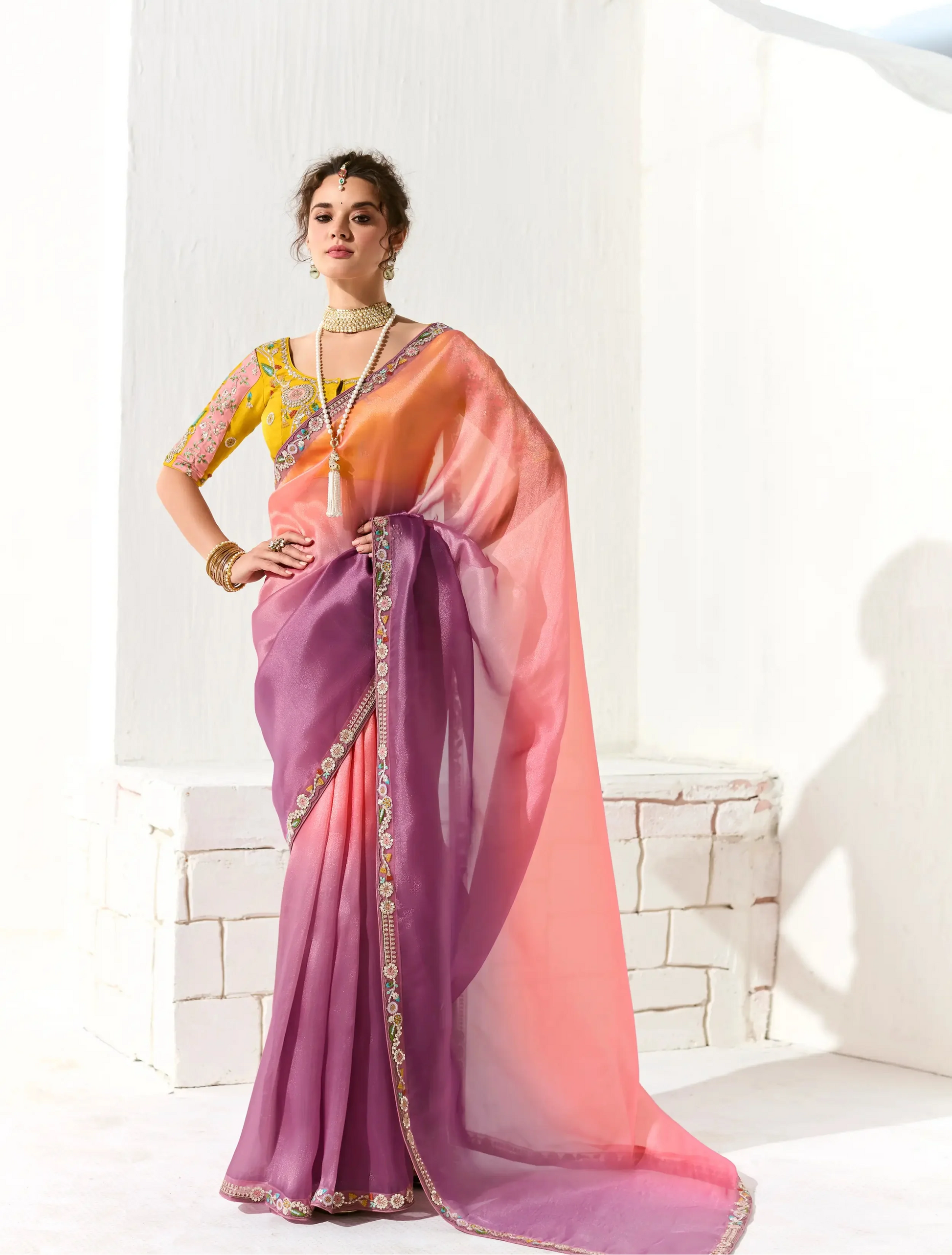 Peach-Lavender Shaded Organza Saree Blouse With Heavy Embroidery work
