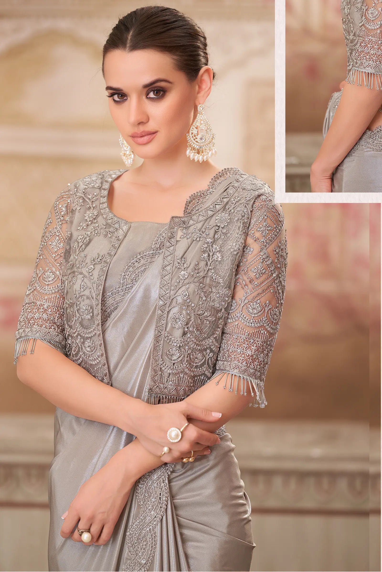 Pearl Grey Georgette Party Wear jacket Saree With Sequence & Thread Embroidery Work