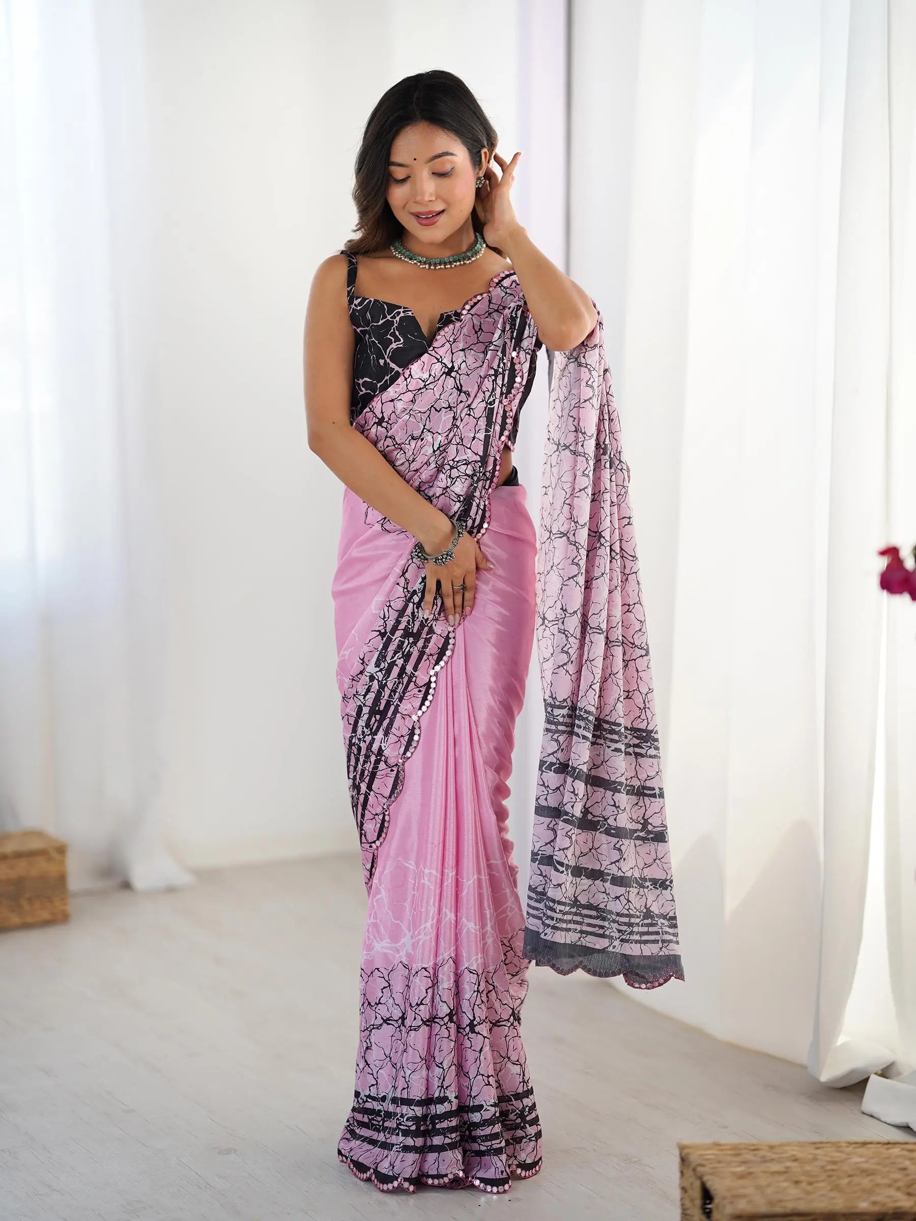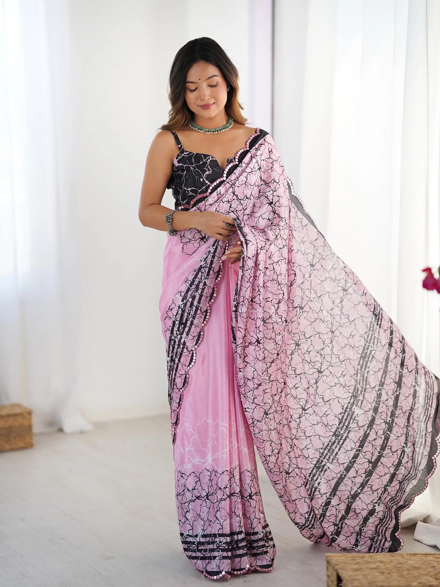 Pink Chinon Saree with Designer Digital Print & Mirror Cut Work