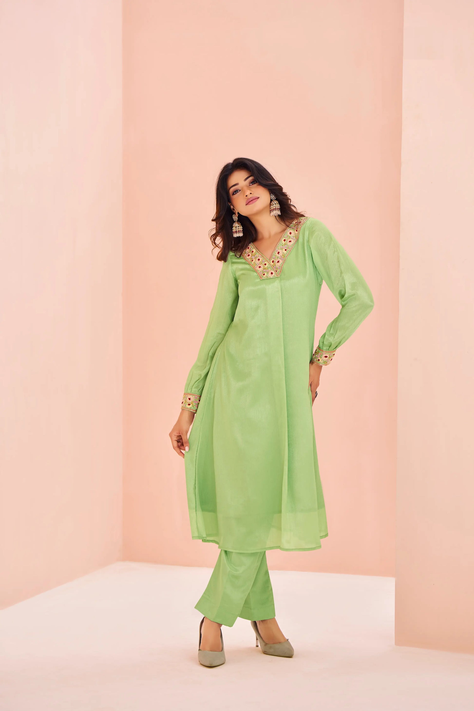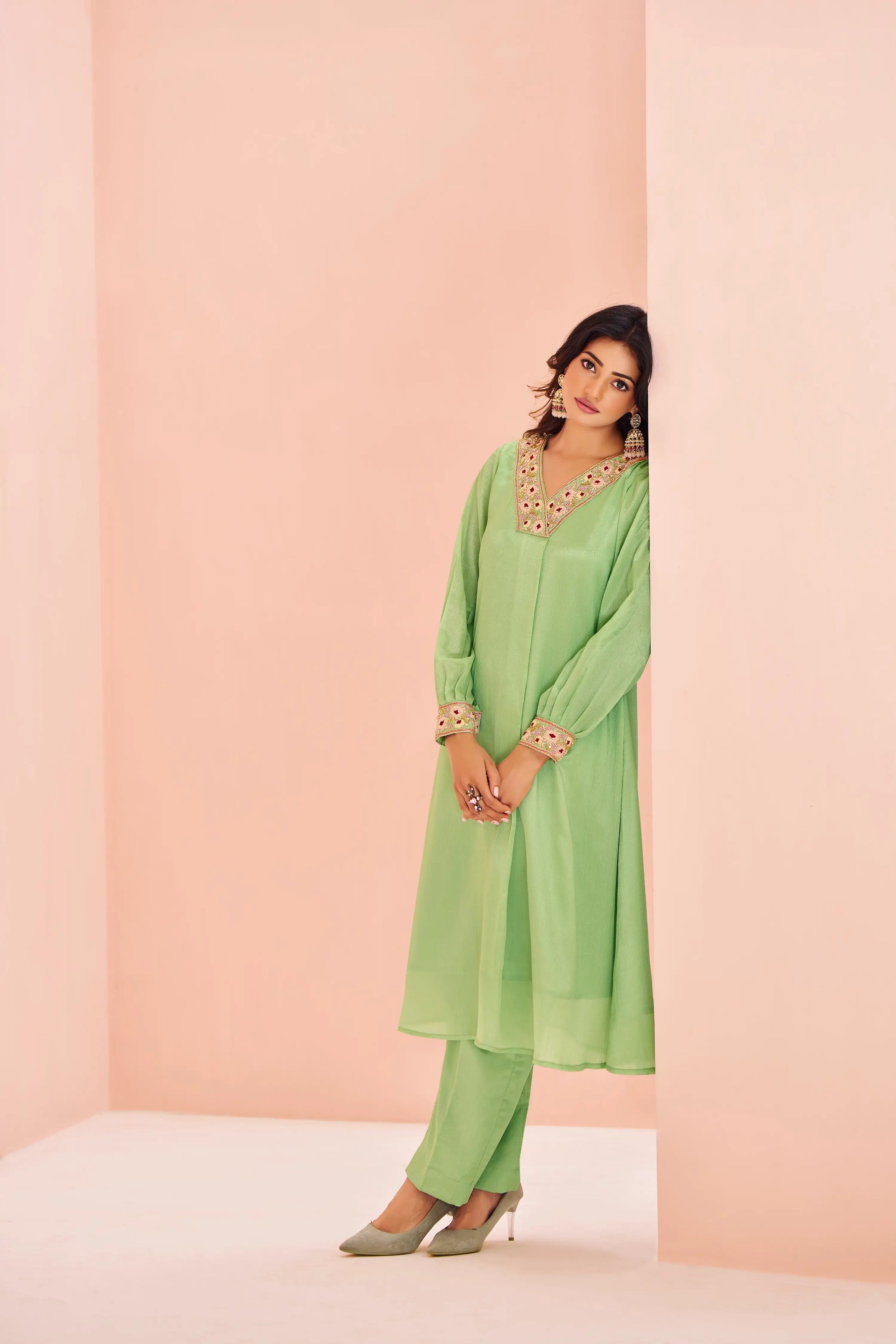Celebrate the upcoming wedding season with this beautiful Pure Blooming Pista Green Chinon Fabric Straight Fit Kurta Set. The set includes a stylish kurta with matching trouser. Ready to wear, it’s the perfect choice for festive occasions, offering both elegance and comfort.